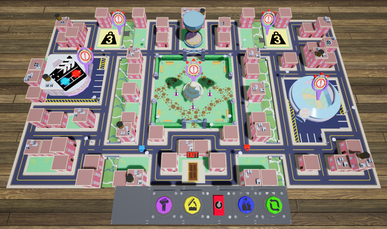 Revisiting the original layout, we added more space throughout the level. A big change came from utilizing updated art assets to have 2 stand out landmarks on the left and right of the map. As well as the very open park in the center, allowing players a lot of freedom upon starting the game.